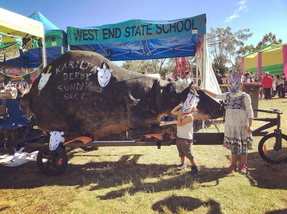 I had been watching a lot of documentaries leading up to this writing experiment, on Brett Whiteley, on Van Gogh, on how the mind works by association, and so it doesn’t surprise me that I began writing about the most recent documentary I’d watched. It felt as though my mind needed this jumping off point, a scaffold of sorts to prop itself up so that it could ‘get going’. And go it did, jumping from the ‘real time’ scene in my garden, the insects and light and shadow and sounds, to what seemed like a random image of a water rat being carried down the street near QPAC in Brisbane. Where did that come from? It wasn’t until I read back over what I’d written, and traced my thoughts back over the previous day or two, that I realised that I had seen a photo posted on Facebook about the West End Kurilpa Derby: specifically, a photo of a water rat sculpture which was to be part of the procession along Boundary Street. See the photos below: