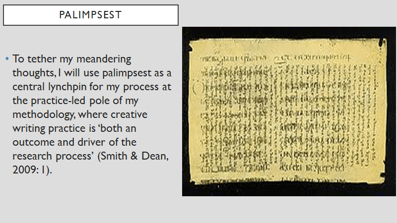 Like in Kawka’s play, reflections on my writing reveal the circular nature of my thinking about Bohemianism, and yet I am keenly aware that a research methodology which operates within a ‘rhizomic’ framework must embrace this quality as Deleuze and Guittari describe the rhizome as having ‘neither beginning nor end, but always a middle (milieu) from which it grows…defined solely by a circulation of states’ (1987: 21).  The meandering nature of thinking Kawka refers to is also observed by Nigel Krauth in his ‘By the Fingernails’ piece which ‘tests the concept of memoirist narrative structure’ (2015, p. 5).   His recollections veer from memory fragment to fragment, and he analyses these images in the unbroken course of his writing.  When a vision of a carpark near where his mother’s house unexpectedly appears in his mind, Krauth asks, ‘How come I can see it so clearly now?’ He goes on to analyse the memory: ‘This image welled up from within me because it represents a whole lot of stuff making traffic in my brain at a subconscious level. Wow! Clearly, my mother is important to me’ (2015, p. 4).  Considering discoveries made through my reflective writing approach, as well as the insights offered by Kawka and Krauth regarding the value of thinking about thinking, I aim to tether my meandering thoughts to make them more accessible and amenable to analysis.  In order to achieve this tethering of thoughts, palimpsest will be a central lynchpin for my process at the practice-led pole of my methodology, where creative writing practice is ‘both an outcome and driver of the research process’ (Smith & Dean, 2009: 1).