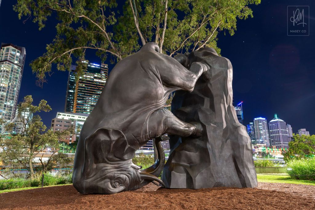 Interestingly though, I didn’t see the rat as it appears in these photos; rather I saw it travelling down the far end of Boundary Street, near the intersection in front of the Performing Arts Complex and Museum… from my view (in my mind), I must have been standing over near where the Art Gallery is, although it felt like I was standing further away near Goma, and I was elevated because I had a bird’s eye view of the enormous rat – there was fanfare, streamers, confetti – the water rat was clearly an honoured and prized citizen or symbol of West End, of that side of the river.